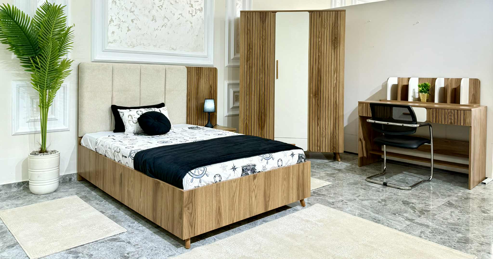 La chambre junior Anas se distingue par son design contemporain alliant raffinement et simplicité. Son esthétique épurée marie harmonieusement beige et effet bois, créant une atmosphère apaisante, moderne et sophistiquée.