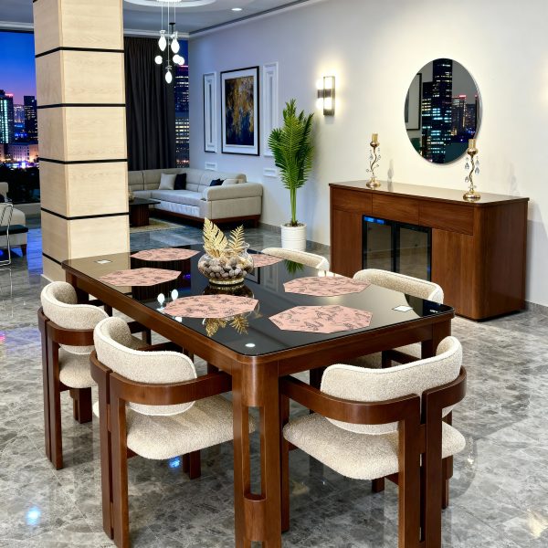 Pièce maîtresse de cet ensemble, la table à manger en bois se distingue par son allure imposante et son esthétique soignée. Elle peut accueillir confortablement jusqu’à six convives. Parfaite pour les repas en famille ou les dîners entre amis, elle crée immédiatement une atmosphère conviviale et chaleureuse.
