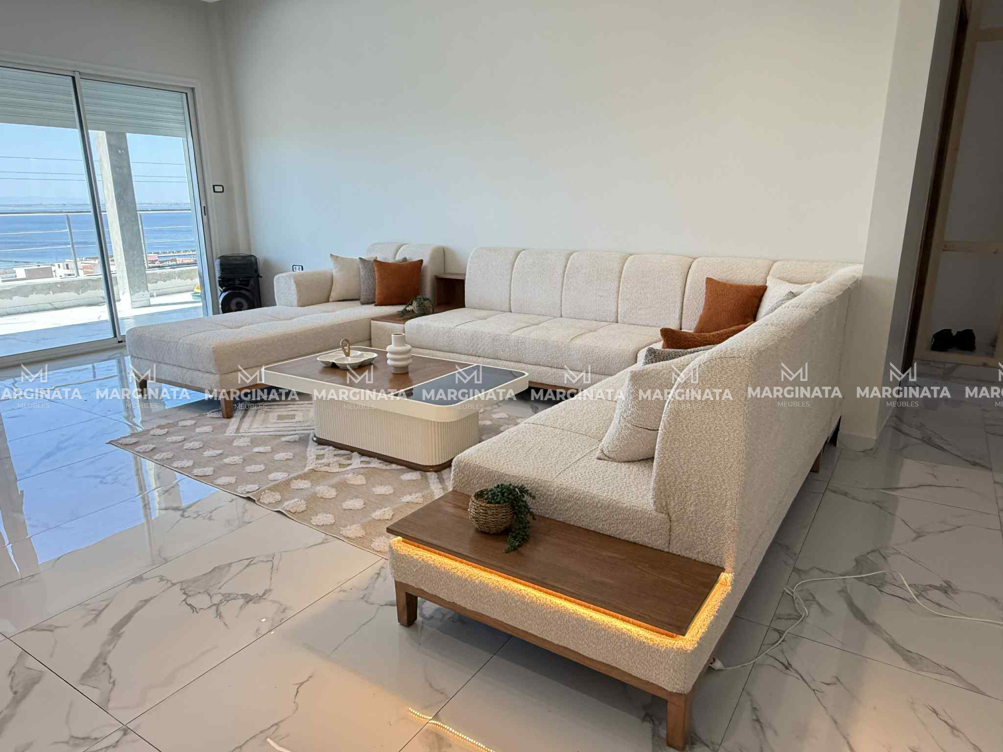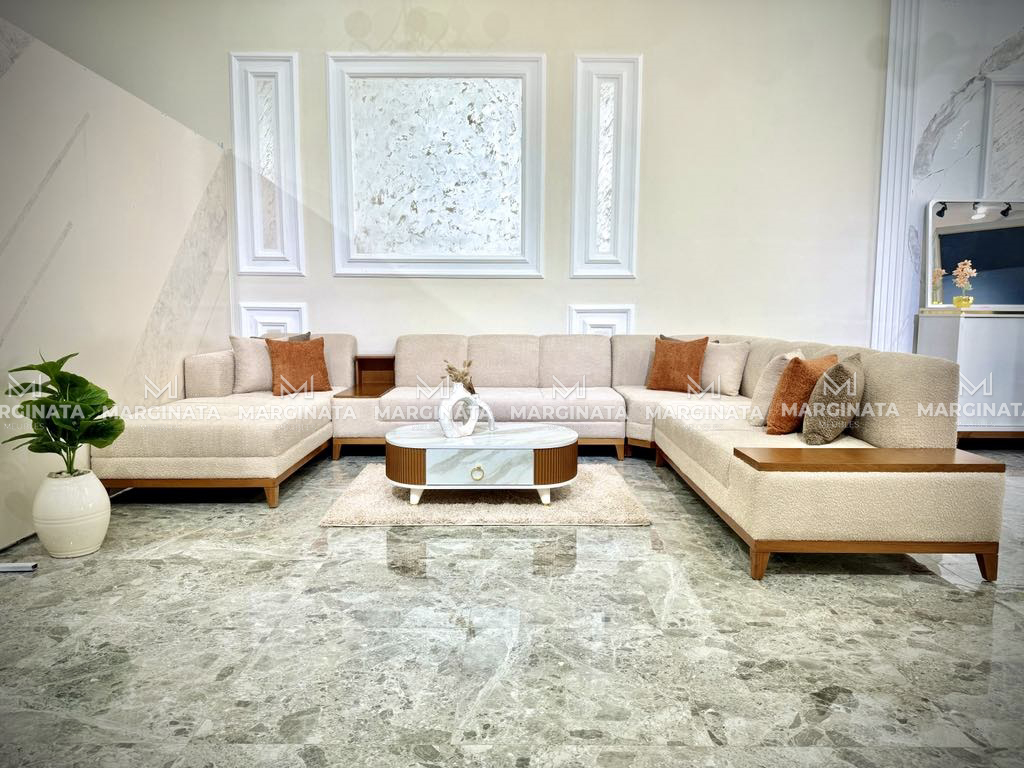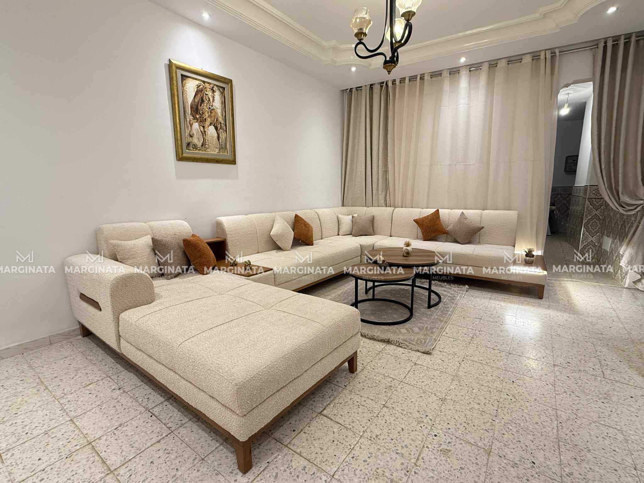 Le salon Nour séduit par ses lignes douces, ses courbes subtiles et sa palette de tons neutres, qui en font un atout majeur pour tout espace de vie.