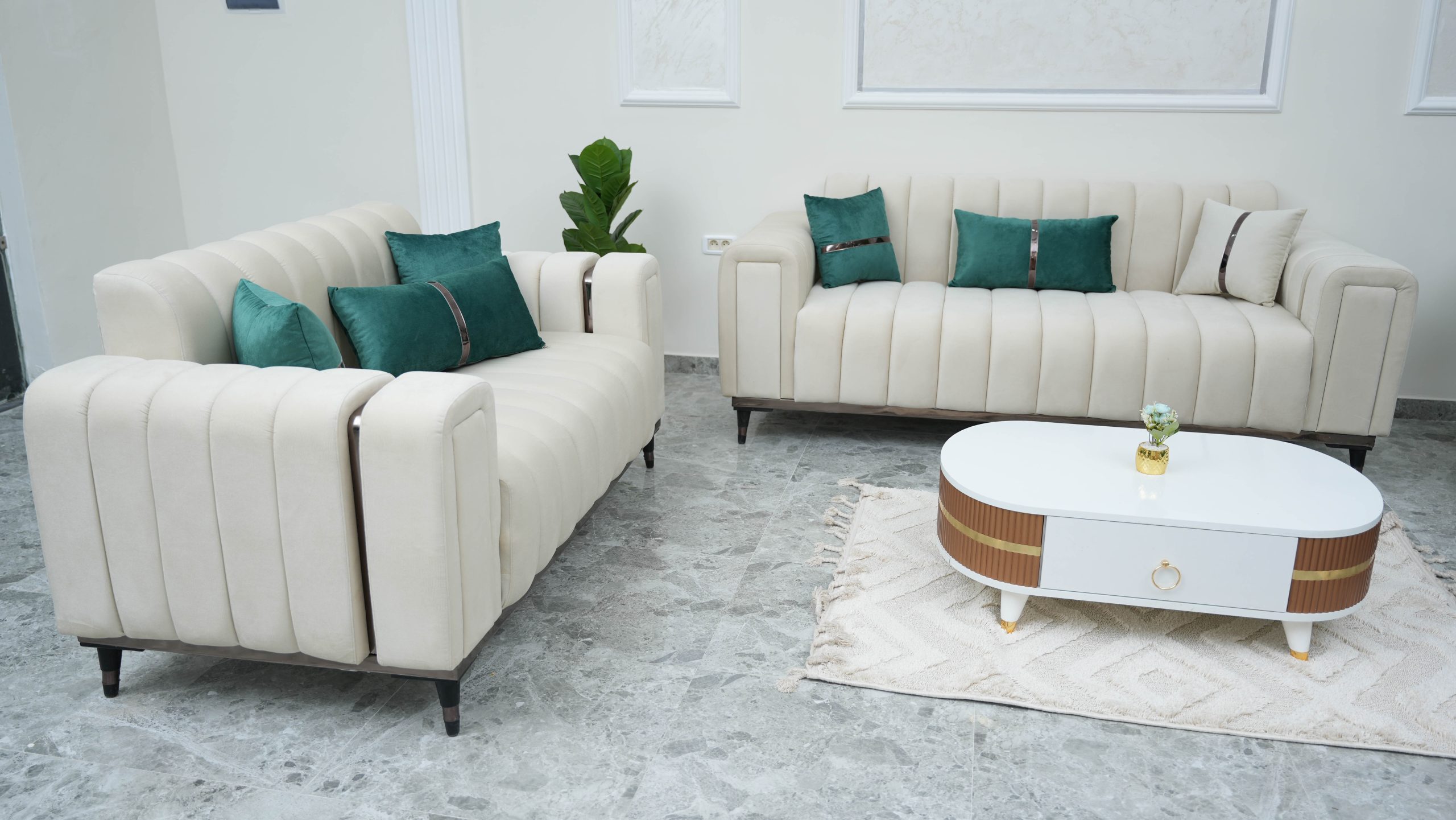 Le salon moderne Ritej séduit par son design unique et son élégant tissu capitonné à coutures verticales, offrant un rendu à la fois esthétique et contemporain.